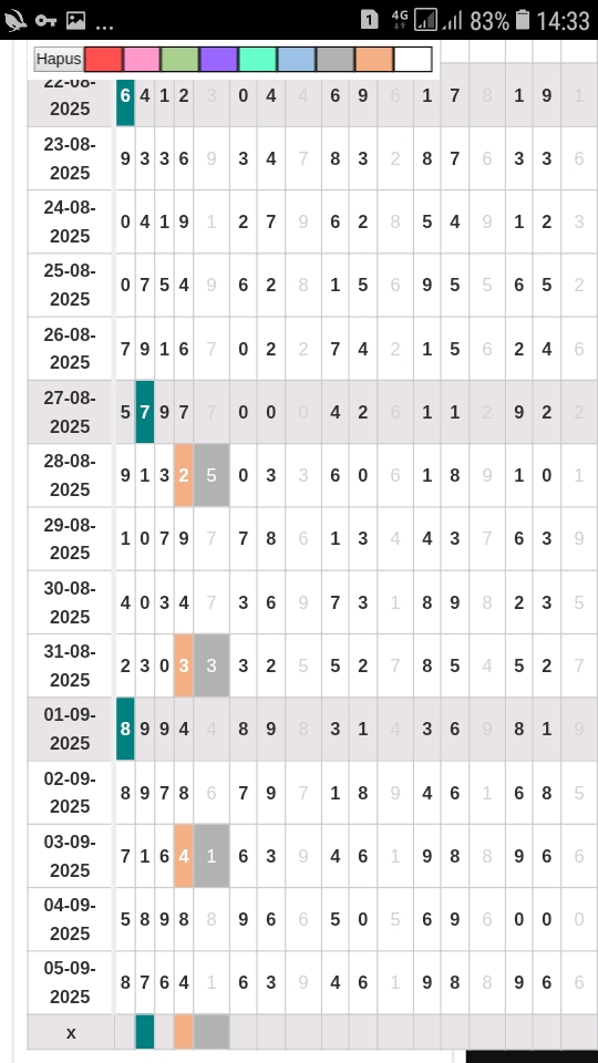 Rumus Angka Mati berdasarkan kepala harian | 04 05 06 07 08 09 10 15 16 17 18 21 26 28 29 30 31 32 41 42 43 52 53 54 64 65 72 73 75 76 83 84 86 93 94 95 96 97 98 |