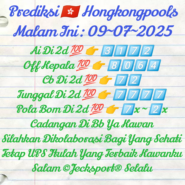 Prediksi HK Jumat, 03-10-2025 Merupakan Prediksi Otomatis yang menggabungkan Metode Kalender Togel Dengan LN Generator yang akurasi prediksinya sudah kita ketahui bersama. Jadi harap Maklum Jika kadang meleset Prediksi HK kita. Jadikan ini sebagai perbandingan saja dan tetap Utamakan karya sendiri