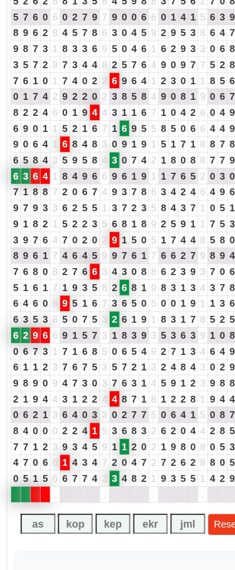 Rumus Angka Mati berdasarkan kepala harian05 06 08 10 15 16 17 18 19 20 21 26 27 28 29 30 32 37 38 39 40 41 43 48 52 53 54 63 64 65 74 75 76 86 87 94 95 97 98