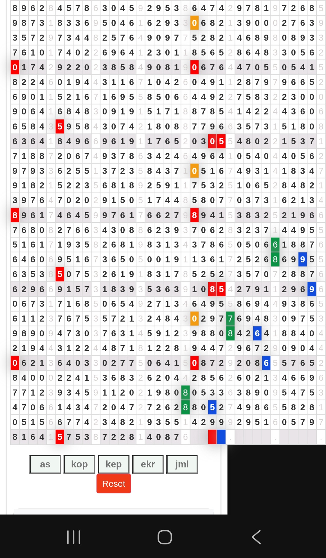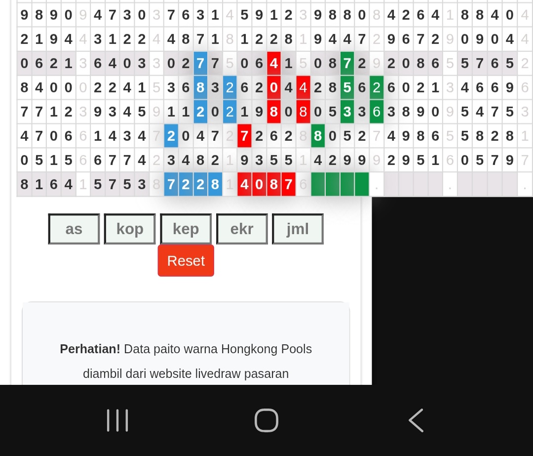 Rumus Angka Mati berdasarkan kepala harian | 05 06 08 10 15 16 17 18 19 20 21 26 27 28 29 30 32 37 38 39 40 41 43 48 52 53 54 63 64 65 74 75 76 86 87 94 95 97 98 |