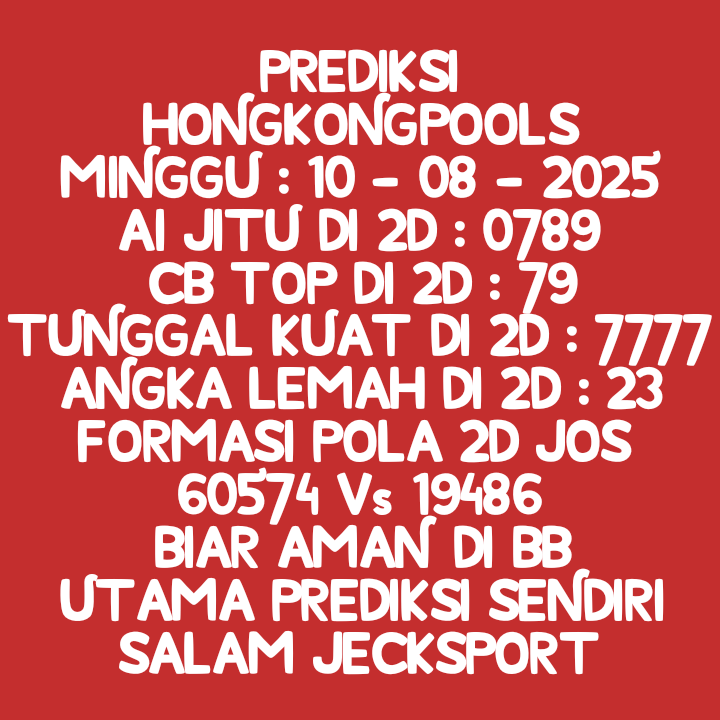 Prediksi HK Sabtu, 04-10-2025 Merupakan Prediksi Otomatis yang menggabungkan Metode Kalender Togel Dengan LN Generator yang akurasi prediksinya sudah kita ketahui bersama. Jadi harap Maklum Jika kadang meleset Prediksi HK kita. Jadikan ini sebagai perbandingan saja dan tetap Utamakan karya sendiri