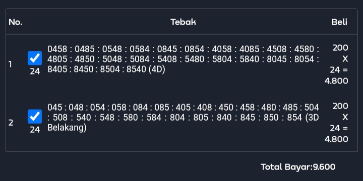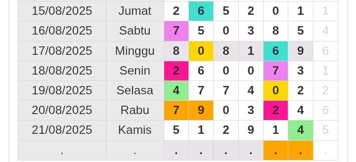 Rumus Angka Mati berdasarkan kepala harian | 08 09 10 16 17 19 20 27 28 30 31 32 37 38 39 40 41 42 43 48 49 50 51 52 54 59 60 62 63 65 74 75 76 85 86 87 96 97 98 |