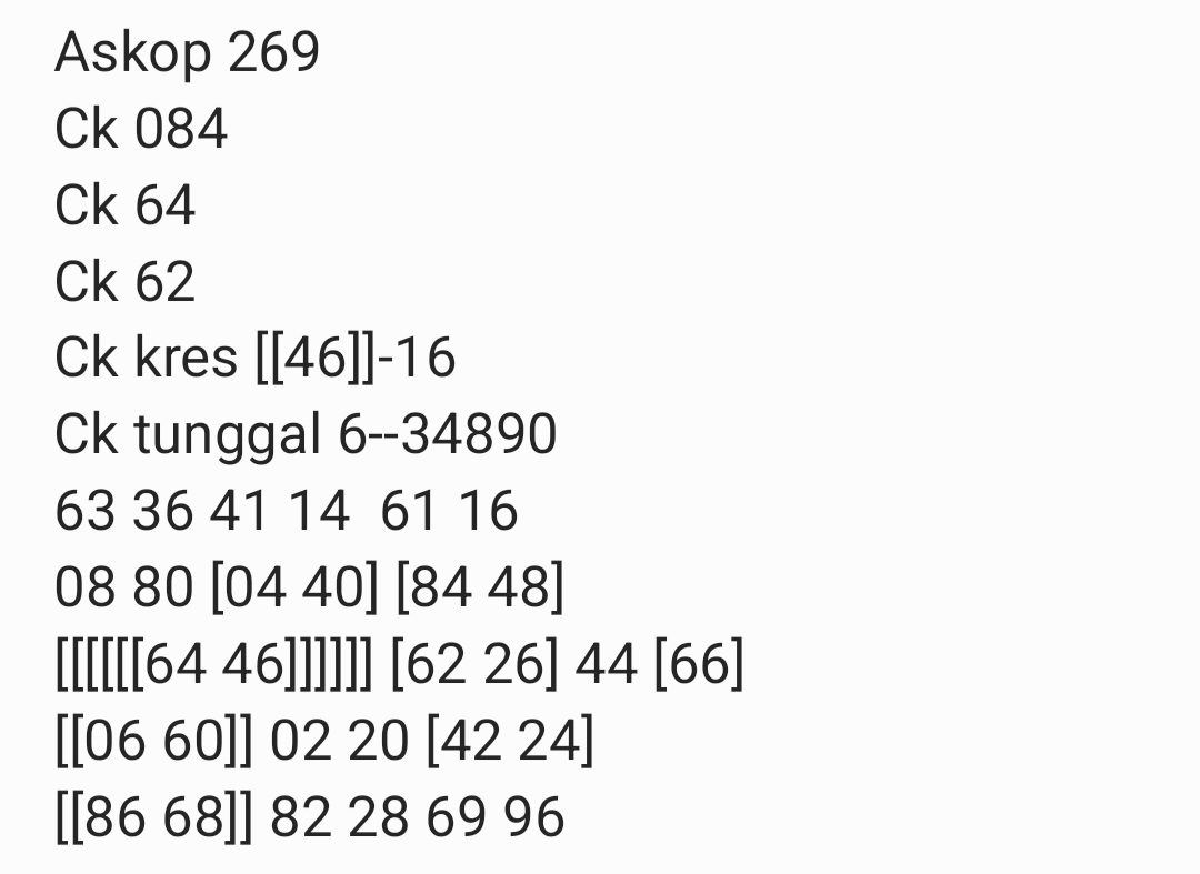Rumus Angka Mati berdasarkan kepala harian | 05 06 08 10 15 16 17 18 19 20 21 26 27 28 29 30 32 37 38 39 40 41 43 48 52 53 54 63 64 65 74 75 76 86 87 94 95 97 98 |