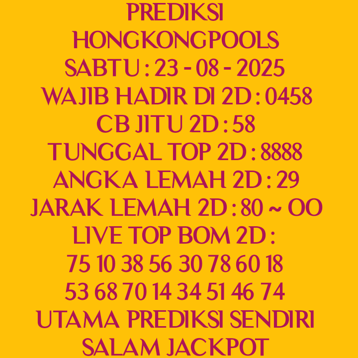 Prediksi HK Jumat, 03-10-2025 Merupakan Prediksi Otomatis yang menggabungkan Metode Kalender Togel Dengan LN Generator yang akurasi prediksinya sudah kita ketahui bersama. Jadi harap Maklum Jika kadang meleset Prediksi HK kita. Jadikan ini sebagai perbandingan saja dan tetap Utamakan karya sendiri
