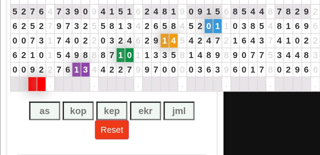 Rumus Angka Mati berdasarkan kepala harian | 05 06 08 10 15 16 17 18 19 20 21 26 27 28 29 30 32 37 38 39 40 41 43 48 52 53 54 63 64 65 74 75 76 86 87 94 95 97 98 |