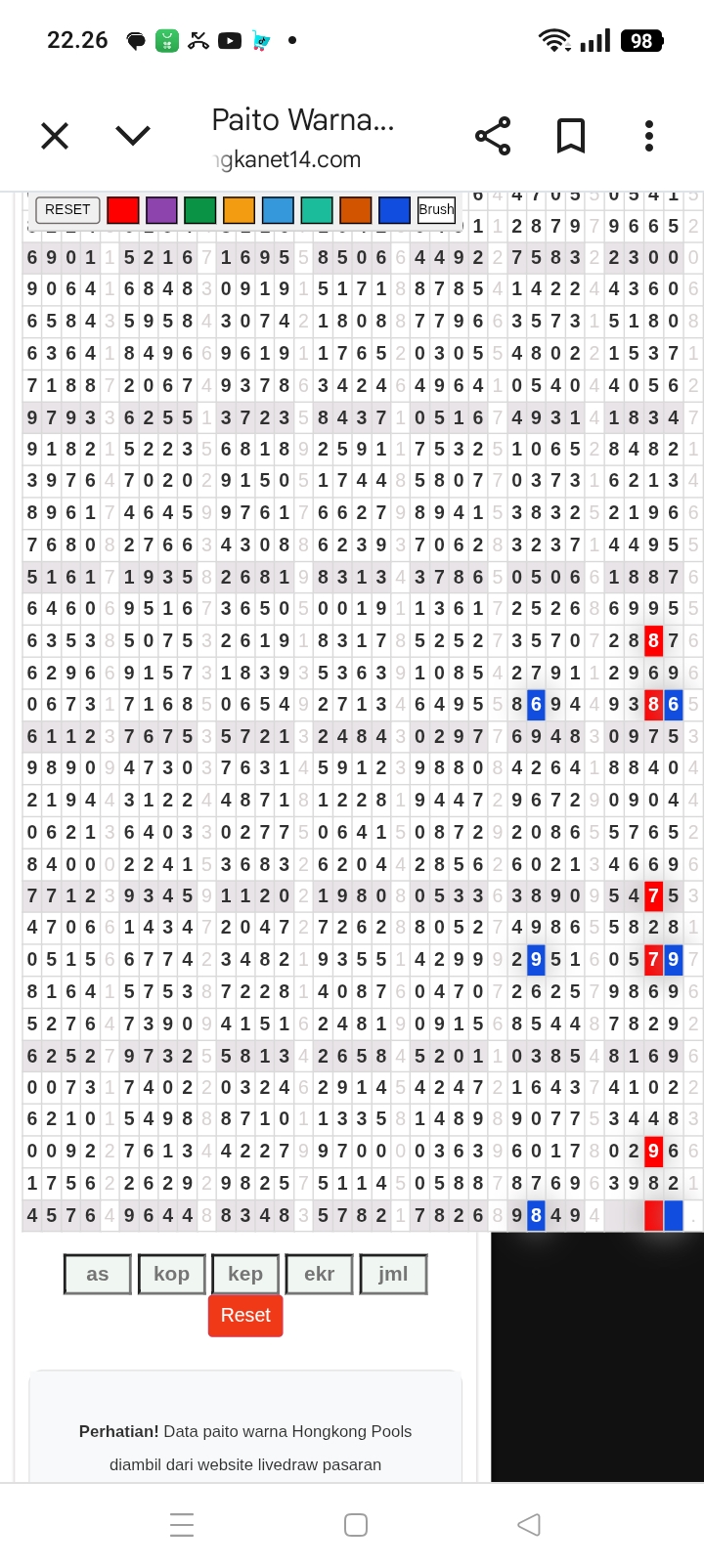 Rumus Angka Mati berdasarkan kepala harian | 05 06 08 10 15 16 17 18 19 20 21 26 27 28 29 30 32 37 38 39 40 41 43 48 52 53 54 63 64 65 74 75 76 86 87 94 95 97 98 |