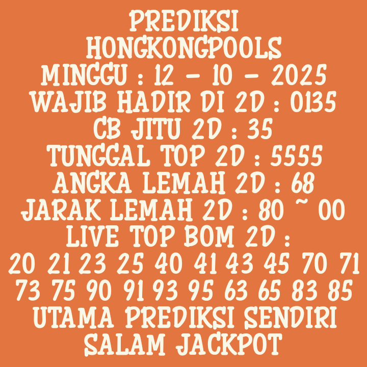 Prediksi HK Senin, 06-10-2025 Merupakan Prediksi Otomatis yang menggabungkan Metode Kalender Togel Dengan LN Generator yang akurasi prediksinya sudah kita ketahui bersama. Jadi harap Maklum Jika kadang meleset Prediksi HK kita. Jadikan ini sebagai perbandingan saja dan tetap Utamakan karya sendiri