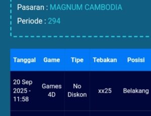 Prediksi Magnum Cambodia Sabtu, 06-09-2025 Merupakan Prediksi Otomatis yang menggabungkan Metode Kalender Togel Dengan LN Generator yang akurasi prediksinya sudah kita ketahui bersama. Jadi harap Maklum Jika kadang meleset Prediksi Magnum Cambodia kita. Jadikan ini sebagai perbandingan saja dan tetap Utamakan karya sendiri