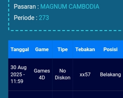 Prediksi Magnum Cambodia Sabtu, 06-09-2025 Merupakan Prediksi Otomatis yang menggabungkan Metode Kalender Togel Dengan LN Generator yang akurasi prediksinya sudah kita ketahui bersama. Jadi harap Maklum Jika kadang meleset Prediksi Magnum Cambodia kita. Jadikan ini sebagai perbandingan saja dan tetap Utamakan karya sendiri