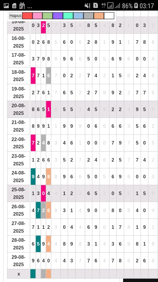 Rumus Angka Mati berdasarkan kepala harian | 08 09 10 16 17 19 20 27 28 30 31 32 37 38 39 40 41 42 43 48 49 50 51 52 54 59 60 62 63 65 74 75 76 85 86 87 96 97 98 |