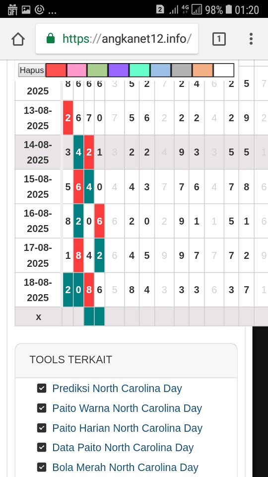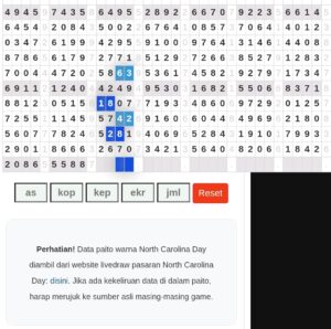 Prediksi North Carolina Day Minggu, 05-10-2025 Merupakan Prediksi Otomatis yang menggabungkan Metode Kalender Togel Dengan LN Generator yang akurasi prediksinya sudah kita ketahui bersama. Jadi harap Maklum Jika kadang meleset Prediksi North Carolina Day kita. Jadikan ini sebagai perbandingan saja dan tetap Utamakan karya sendiri