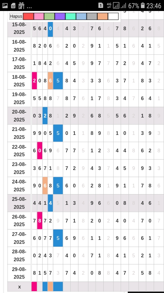 Rumus Angka Mati berdasarkan kepala harian | 04 05 06 07 08 09 10 15 16 17 18 21 26 28 29 30 31 32 41 42 43 52 53 54 64 65 72 73 75 76 83 84 86 93 94 95 96 97 98 |