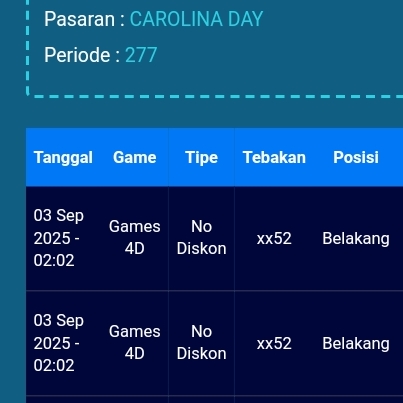 Prediksi North Carolina Day Sabtu, 04-10-2025 Merupakan Prediksi Otomatis yang menggabungkan Metode Kalender Togel Dengan LN Generator yang akurasi prediksinya sudah kita ketahui bersama. Jadi harap Maklum Jika kadang meleset Prediksi North Carolina Day kita. Jadikan ini sebagai perbandingan saja dan tetap Utamakan karya sendiri