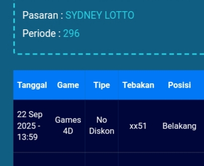 Prediksi Sydney Lotto Sabtu, 04-10-2025 Merupakan Prediksi Otomatis yang menggabungkan Metode Kalender Togel Dengan LN Generator yang akurasi prediksinya sudah kita ketahui bersama. Jadi harap Maklum Jika kadang meleset Prediksi Sydney Lotto kita. Jadikan ini sebagai perbandingan saja dan tetap Utamakan karya sendiri