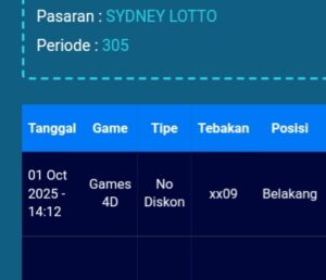 Prediksi Sydney Lotto Sabtu, 04-10-2025 Merupakan Prediksi Otomatis yang menggabungkan Metode Kalender Togel Dengan LN Generator yang akurasi prediksinya sudah kita ketahui bersama. Jadi harap Maklum Jika kadang meleset Prediksi Sydney Lotto kita. Jadikan ini sebagai perbandingan saja dan tetap Utamakan karya sendiri