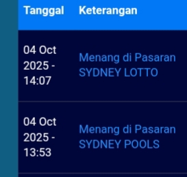 Prediksi Sydney Lotto Minggu, 05-10-2025 Merupakan Prediksi Otomatis yang menggabungkan Metode Kalender Togel Dengan LN Generator yang akurasi prediksinya sudah kita ketahui bersama. Jadi harap Maklum Jika kadang meleset Prediksi Sydney Lotto kita. Jadikan ini sebagai perbandingan saja dan tetap Utamakan karya sendiri