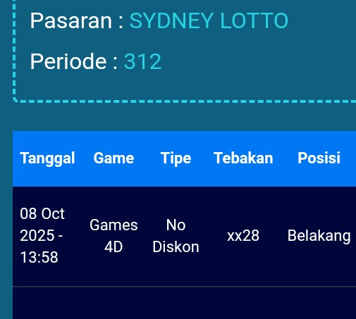 Prediksi Sydney Lotto Senin, 22-09-2025 Merupakan Prediksi Otomatis yang menggabungkan Metode Kalender Togel Dengan LN Generator yang akurasi prediksinya sudah kita ketahui bersama. Jadi harap Maklum Jika kadang meleset Prediksi Sydney Lotto kita. Jadikan ini sebagai perbandingan saja dan tetap Utamakan karya sendiri