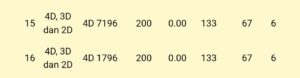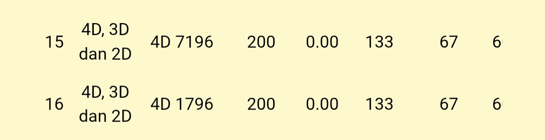4D, 3D dan 2D 4D 7196 200 0.00 133 67