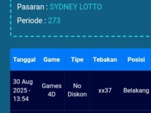 Prediksi Sydney Lotto Sabtu, 04-10-2025 Merupakan Prediksi Otomatis yang menggabungkan Metode Kalender Togel Dengan LN Generator yang akurasi prediksinya sudah kita ketahui bersama. Jadi harap Maklum Jika kadang meleset Prediksi Sydney Lotto kita. Jadikan ini sebagai perbandingan saja dan tetap Utamakan karya sendiri