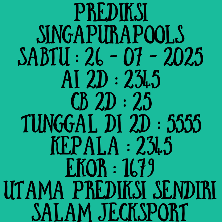 Prediksi Singapore Rabu, 01-10-2025 Merupakan Prediksi Otomatis yang menggabungkan Metode Kalender Togel Dengan LN Generator yang akurasi prediksinya sudah kita ketahui bersama. Jadi harap Maklum Jika kadang meleset Prediksi Singapore kita. Jadikan ini sebagai perbandingan saja dan tetap Utamakan karya sendiri