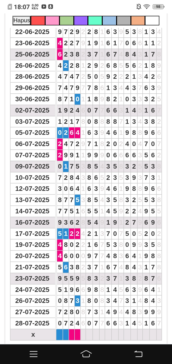Rumus Angka Mati berdasarkan kepala harian | 07 08 09 10 18 19 20 21 31 32 38 39 40 42 49 50 51 52 53 54 59 60 61 62 63 64 65 71 72 73 74 76 82 84 85 87 96 97 98 |