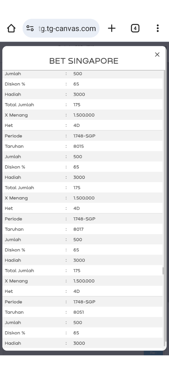 Prediksi Singapore Sabtu, 04-10-2025 Merupakan Prediksi Otomatis yang menggabungkan Metode Kalender Togel Dengan LN Generator yang akurasi prediksinya sudah kita ketahui bersama. Jadi harap Maklum Jika kadang meleset Prediksi Singapore kita. Jadikan ini sebagai perbandingan saja dan tetap Utamakan karya sendiri