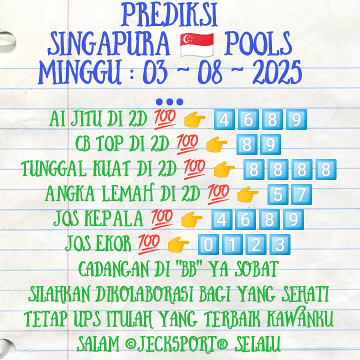 Prediksi Singapore Minggu, 05-10-2025 Merupakan Prediksi Otomatis yang menggabungkan Metode Kalender Togel Dengan LN Generator yang akurasi prediksinya sudah kita ketahui bersama. Jadi harap Maklum Jika kadang meleset Prediksi Singapore kita. Jadikan ini sebagai perbandingan saja dan tetap Utamakan karya sendiri