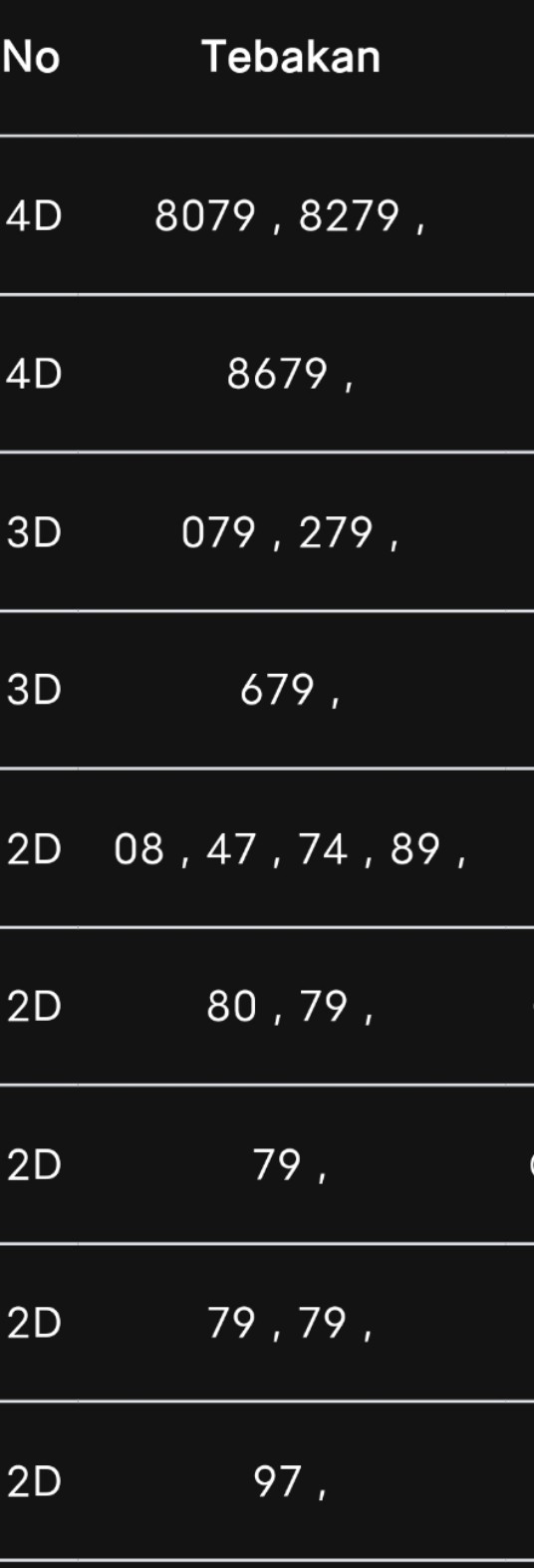 Rumus Angka Mati berdasarkan kepala harian | 07 08 09 10 18 19 20 21 31 32 38 39 40 42 49 50 51 52 53 54 59 60 61 62 63 64 65 71 72 73 74 76 82 84 85 87 96 97 98 |