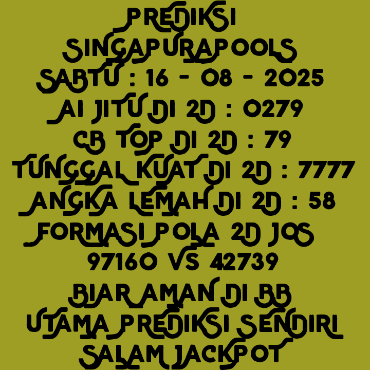 Prediksi Singapore Rabu, 01-10-2025 Merupakan Prediksi Otomatis yang menggabungkan Metode Kalender Togel Dengan LN Generator yang akurasi prediksinya sudah kita ketahui bersama. Jadi harap Maklum Jika kadang meleset Prediksi Singapore kita. Jadikan ini sebagai perbandingan saja dan tetap Utamakan karya sendiri