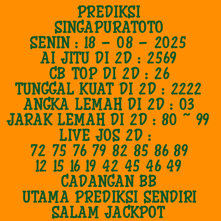 Prediksi Singapore Kamis, 25-09-2025 Merupakan Prediksi Otomatis yang menggabungkan Metode Kalender Togel Dengan LN Generator yang akurasi prediksinya sudah kita ketahui bersama. Jadi harap Maklum Jika kadang meleset Prediksi Singapore kita. Jadikan ini sebagai perbandingan saja dan tetap Utamakan karya sendiri