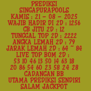 Prediksi Singapore Rabu, 01-10-2025 Merupakan Prediksi Otomatis yang menggabungkan Metode Kalender Togel Dengan LN Generator yang akurasi prediksinya sudah kita ketahui bersama. Jadi harap Maklum Jika kadang meleset Prediksi Singapore kita. Jadikan ini sebagai perbandingan saja dan tetap Utamakan karya sendiri