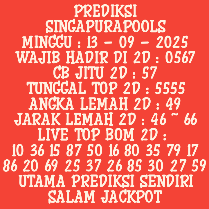 Prediksi Singapore Minggu, 05-10-2025 Merupakan Prediksi Otomatis yang menggabungkan Metode Kalender Togel Dengan LN Generator yang akurasi prediksinya sudah kita ketahui bersama. Jadi harap Maklum Jika kadang meleset Prediksi Singapore kita. Jadikan ini sebagai perbandingan saja dan tetap Utamakan karya sendiri