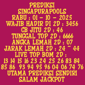 Prediksi Singapore Minggu, 24-08-2025 Merupakan Prediksi Otomatis yang menggabungkan Metode Kalender Togel Dengan LN Generator yang akurasi prediksinya sudah kita ketahui bersama. Jadi harap Maklum Jika kadang meleset Prediksi Singapore kita. Jadikan ini sebagai perbandingan saja dan tetap Utamakan karya sendiri