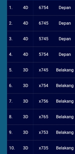 Rumus Angka Mati berdasarkan kepala harian | 05 06 08 09 16 17 19 20 21 26 27 28 29 30 31 32 37 38 39 40 41 43 48 49 51 52 54 59 63 64 65 74 75 76 85 86 87 97 98 |
