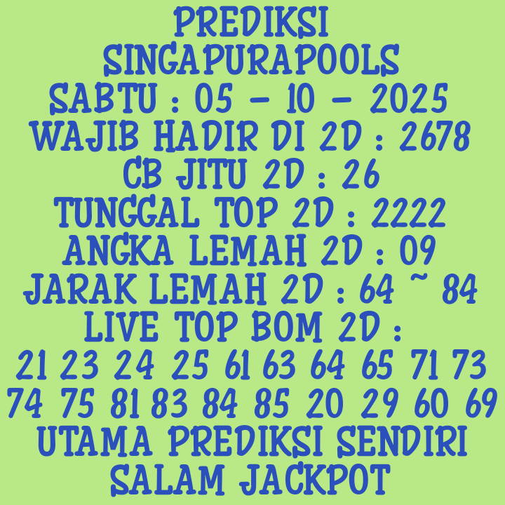 Prediksi Singapore Rabu, 24-09-2025 Merupakan Prediksi Otomatis yang menggabungkan Metode Kalender Togel Dengan LN Generator yang akurasi prediksinya sudah kita ketahui bersama. Jadi harap Maklum Jika kadang meleset Prediksi Singapore kita. Jadikan ini sebagai perbandingan saja dan tetap Utamakan karya sendiri
