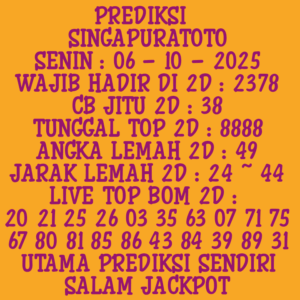 Prediksi Singapore Senin, 22-09-2025 Merupakan Prediksi Otomatis yang menggabungkan Metode Kalender Togel Dengan LN Generator yang akurasi prediksinya sudah kita ketahui bersama. Jadi harap Maklum Jika kadang meleset Prediksi Singapore kita. Jadikan ini sebagai perbandingan saja dan tetap Utamakan karya sendiri