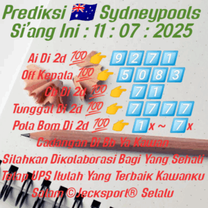 Prediksi Sydneypools Senin, 06-10-2025 Merupakan Prediksi Otomatis yang menggabungkan Metode Kalender Togel Dengan LN Generator yang akurasi prediksinya sudah kita ketahui bersama. Jadi harap Maklum Jika kadang meleset Prediksi Sydneypools kita. Jadikan ini sebagai perbandingan saja dan tetap Utamakan karya sendiri
