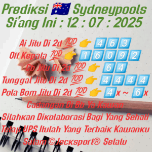 Prediksi Sydneypools Minggu, 05-10-2025 Merupakan Prediksi Otomatis yang menggabungkan Metode Kalender Togel Dengan LN Generator yang akurasi prediksinya sudah kita ketahui bersama. Jadi harap Maklum Jika kadang meleset Prediksi Sydneypools kita. Jadikan ini sebagai perbandingan saja dan tetap Utamakan karya sendiri
