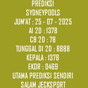 Prediksi Sydneypools Senin, 08-09-2025 Merupakan Prediksi Otomatis yang menggabungkan Metode Kalender Togel Dengan LN Generator yang akurasi prediksinya sudah kita ketahui bersama. Jadi harap Maklum Jika kadang meleset Prediksi Sydneypools kita. Jadikan ini sebagai perbandingan saja dan tetap Utamakan karya sendiri