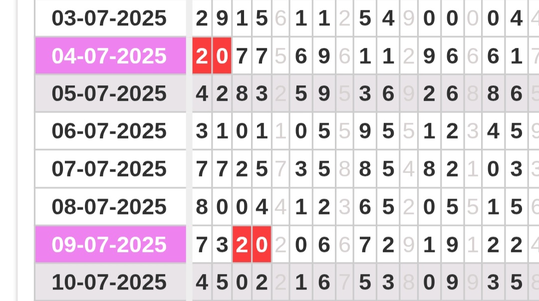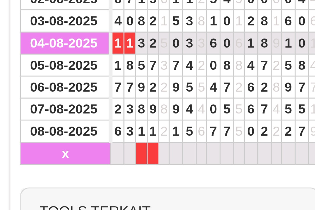 Rumus Angka Mati berdasarkan kepala harian | 07 08 09 10 18 19 20 21 29 31 32 40 42 43 49 50 51 53 60 61 62 63 64 65 71 72 73 74 75 76 82 83 84 85 87 93 95 96 98 |
