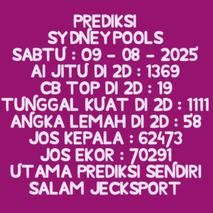Prediksi Sydneypools Sabtu, 04-10-2025 Merupakan Prediksi Otomatis yang menggabungkan Metode Kalender Togel Dengan LN Generator yang akurasi prediksinya sudah kita ketahui bersama. Jadi harap Maklum Jika kadang meleset Prediksi Sydneypools kita. Jadikan ini sebagai perbandingan saja dan tetap Utamakan karya sendiri
