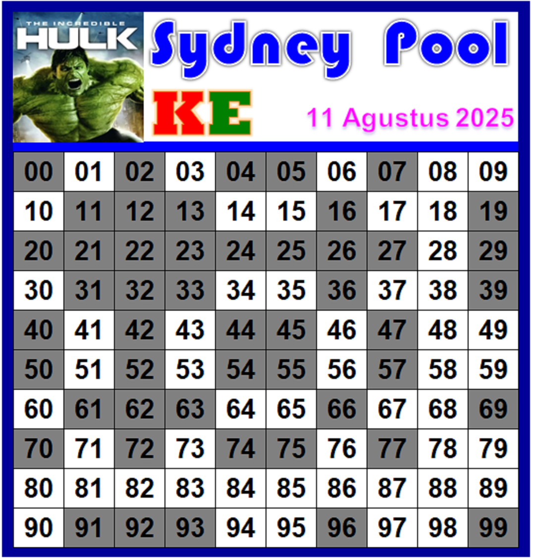 Prediksi Sydneypools Sabtu, 04-10-2025 Merupakan Prediksi Otomatis yang menggabungkan Metode Kalender Togel Dengan LN Generator yang akurasi prediksinya sudah kita ketahui bersama. Jadi harap Maklum Jika kadang meleset Prediksi Sydneypools kita. Jadikan ini sebagai perbandingan saja dan tetap Utamakan karya sendiri