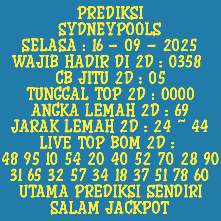 Prediksi Sydneypools Sabtu, 04-10-2025 Merupakan Prediksi Otomatis yang menggabungkan Metode Kalender Togel Dengan LN Generator yang akurasi prediksinya sudah kita ketahui bersama. Jadi harap Maklum Jika kadang meleset Prediksi Sydneypools kita. Jadikan ini sebagai perbandingan saja dan tetap Utamakan karya sendiri