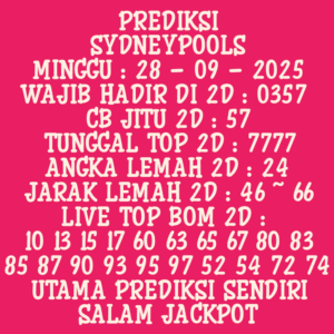 Prediksi Sydneypools Sabtu, 04-10-2025 Merupakan Prediksi Otomatis yang menggabungkan Metode Kalender Togel Dengan LN Generator yang akurasi prediksinya sudah kita ketahui bersama. Jadi harap Maklum Jika kadang meleset Prediksi Sydneypools kita. Jadikan ini sebagai perbandingan saja dan tetap Utamakan karya sendiri