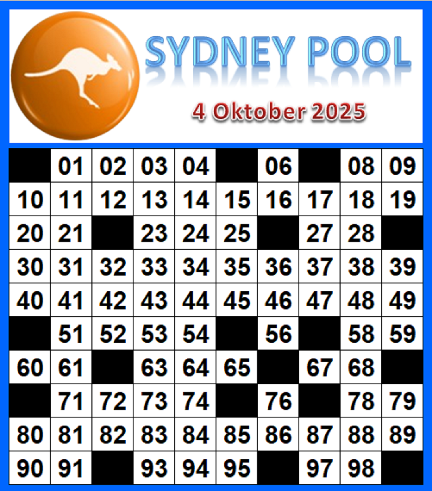 Prediksi Sydneypools Minggu, 05-10-2025 Merupakan Prediksi Otomatis yang menggabungkan Metode Kalender Togel Dengan LN Generator yang akurasi prediksinya sudah kita ketahui bersama. Jadi harap Maklum Jika kadang meleset Prediksi Sydneypools kita. Jadikan ini sebagai perbandingan saja dan tetap Utamakan karya sendiri