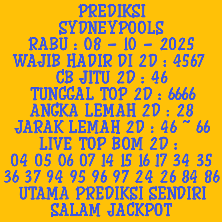 Prediksi Sydneypools Rabu, 24-09-2025 Merupakan Prediksi Otomatis yang menggabungkan Metode Kalender Togel Dengan LN Generator yang akurasi prediksinya sudah kita ketahui bersama. Jadi harap Maklum Jika kadang meleset Prediksi Sydneypools kita. Jadikan ini sebagai perbandingan saja dan tetap Utamakan karya sendiri
