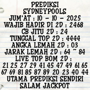 Prediksi Sydneypools Senin, 29-09-2025 Merupakan Prediksi Otomatis yang menggabungkan Metode Kalender Togel Dengan LN Generator yang akurasi prediksinya sudah kita ketahui bersama. Jadi harap Maklum Jika kadang meleset Prediksi Sydneypools kita. Jadikan ini sebagai perbandingan saja dan tetap Utamakan karya sendiri