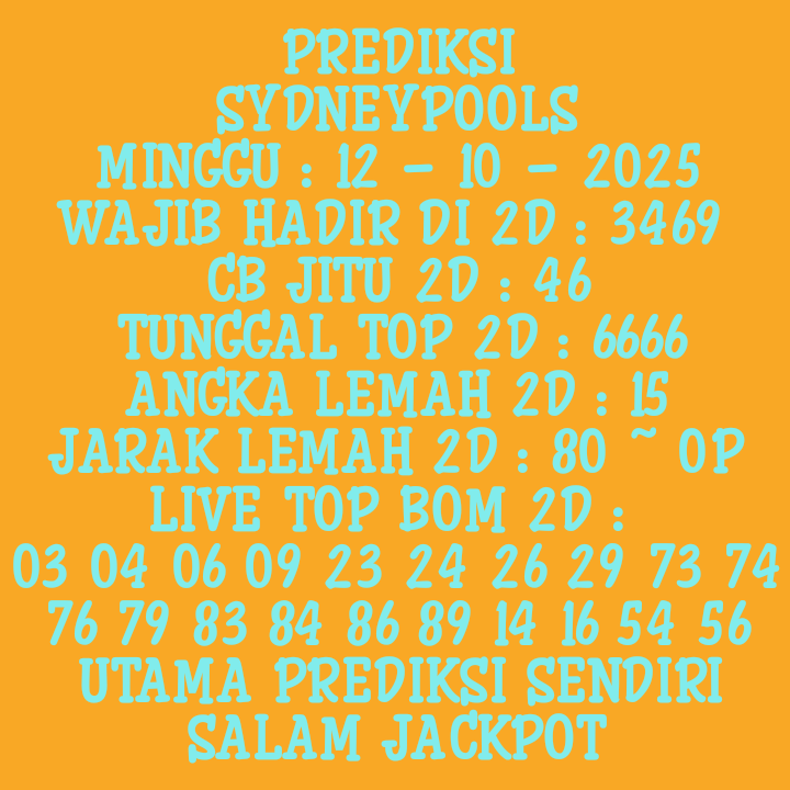Prediksi Sydneypools Senin, 15-09-2025 Merupakan Prediksi Otomatis yang menggabungkan Metode Kalender Togel Dengan LN Generator yang akurasi prediksinya sudah kita ketahui bersama. Jadi harap Maklum Jika kadang meleset Prediksi Sydneypools kita. Jadikan ini sebagai perbandingan saja dan tetap Utamakan karya sendiri