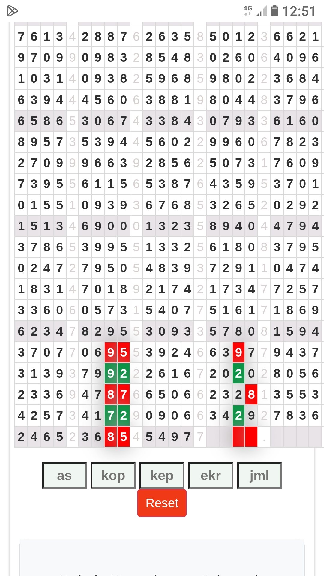 Rumus Angka Mati berdasarkan kepala harian | 04 06 07 09 10 18 19 20 21 29 30 31 32 42 43 50 51 53 54 61 62 64 71 72 73 74 75 76 82 83 84 85 86 87 93 94 95 96 98 |