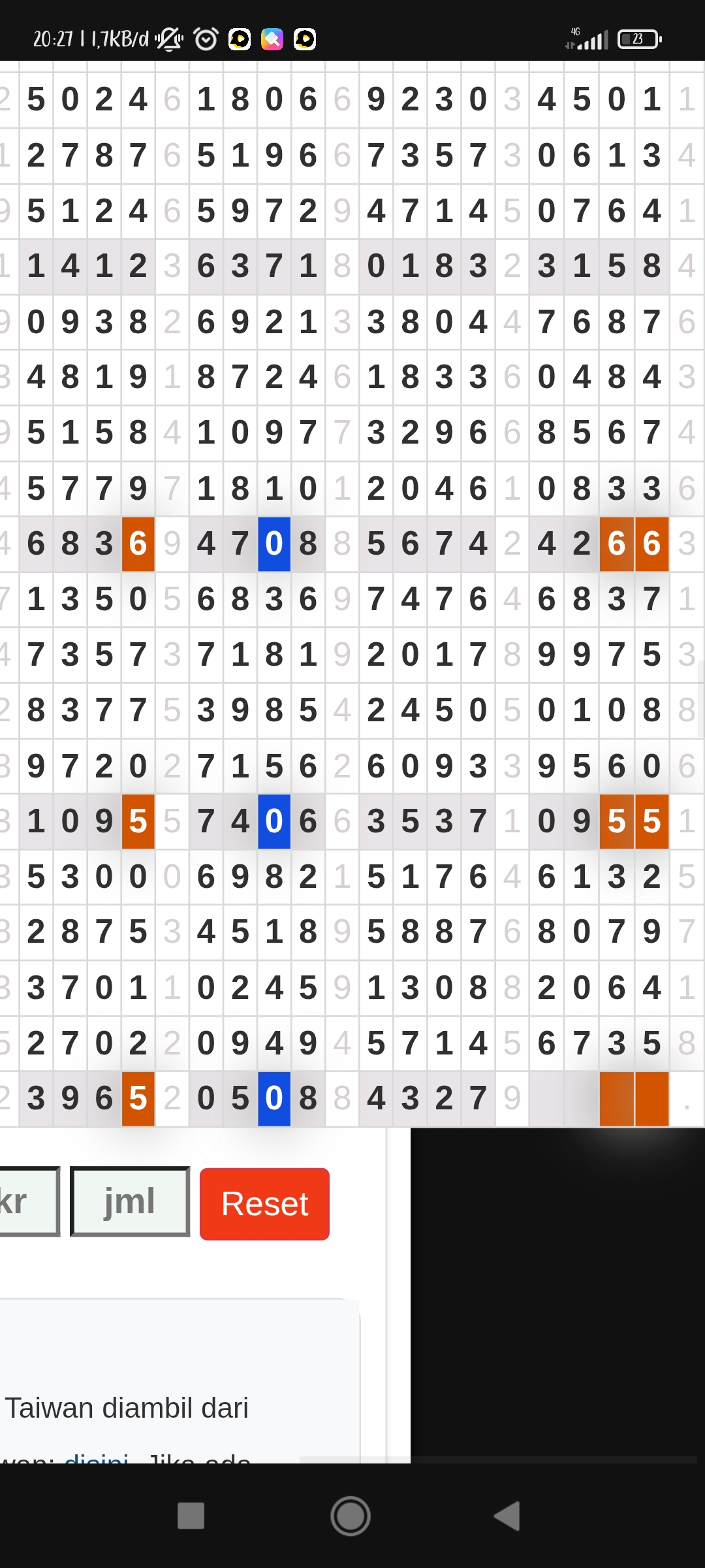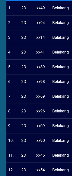 Rumus Angka Mati berdasarkan kepala harian | 04 05 06 07 08 09 10 15 16 17 18 19 21 26 27 28 29 30 32 37 39 41 42 43 52 53 54 63 64 65 75 76 83 84 86 87 94 95 97 |